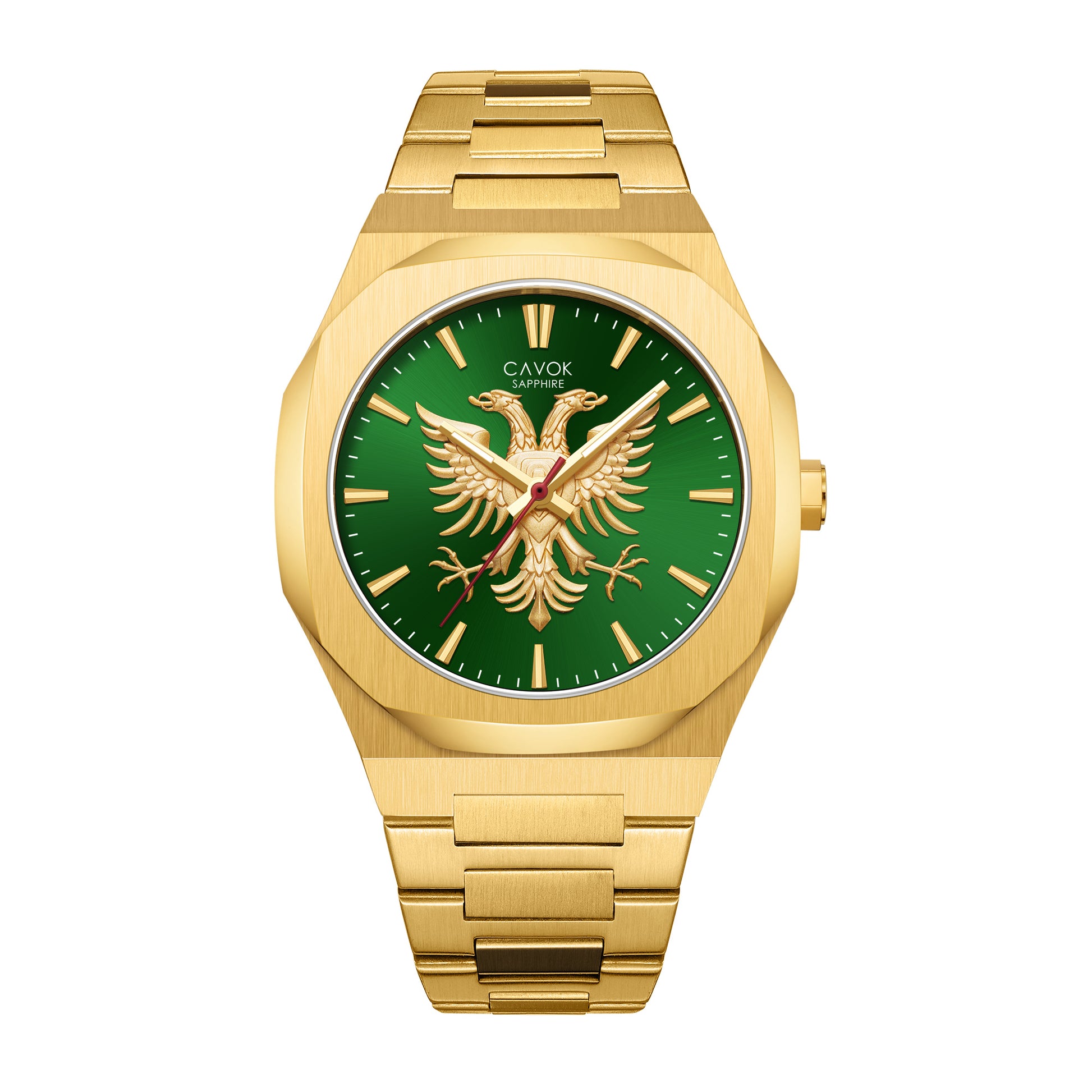 CAVOK Imperium Verde is a bold expression of power and heritage. Featuring a 3D Albanian Eagle on an emerald-green dial, sapphire glass, a precise Miyota quartz movement, and a 3D Illyrian helmet caseback, this is authority, worn.
