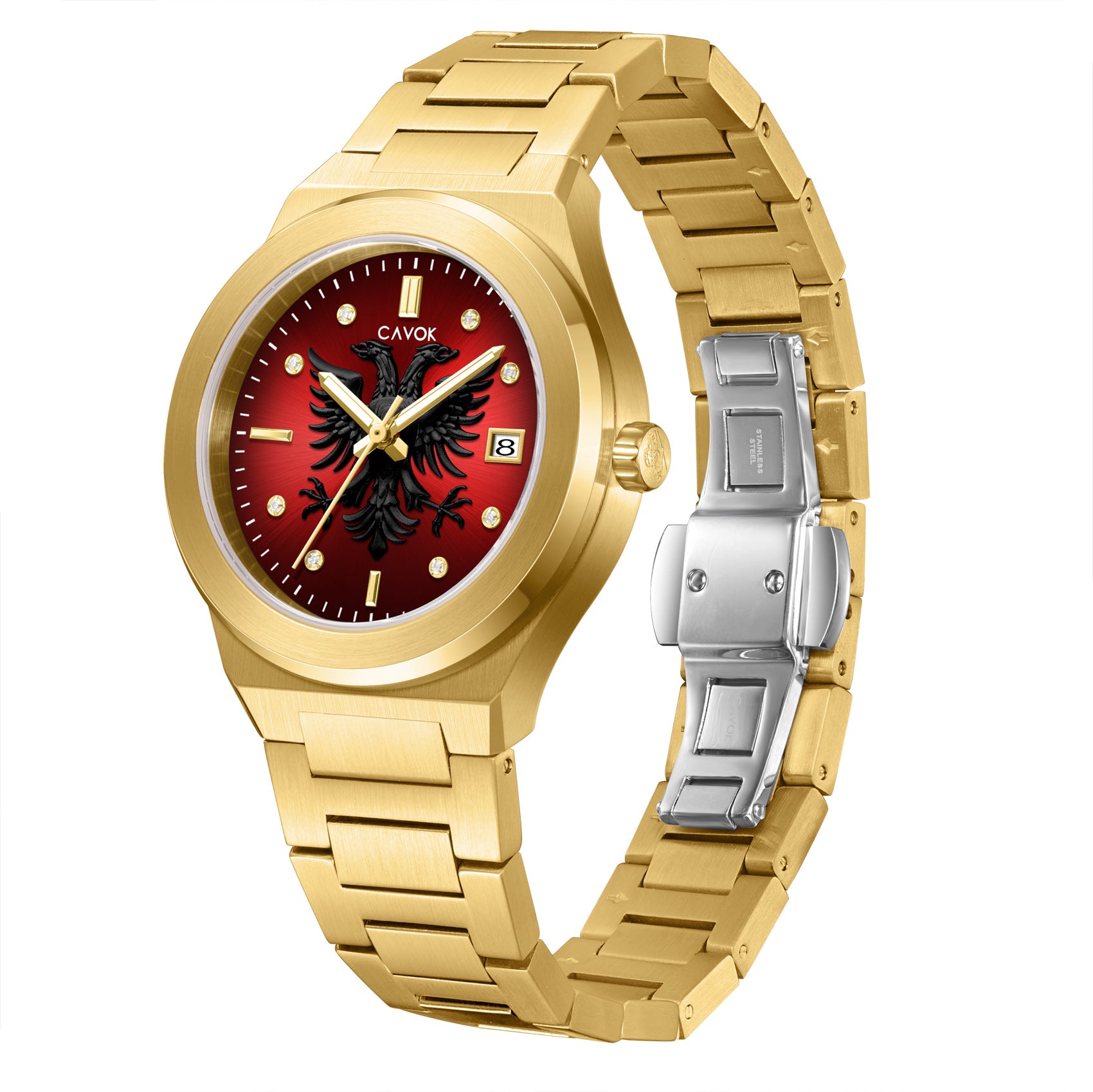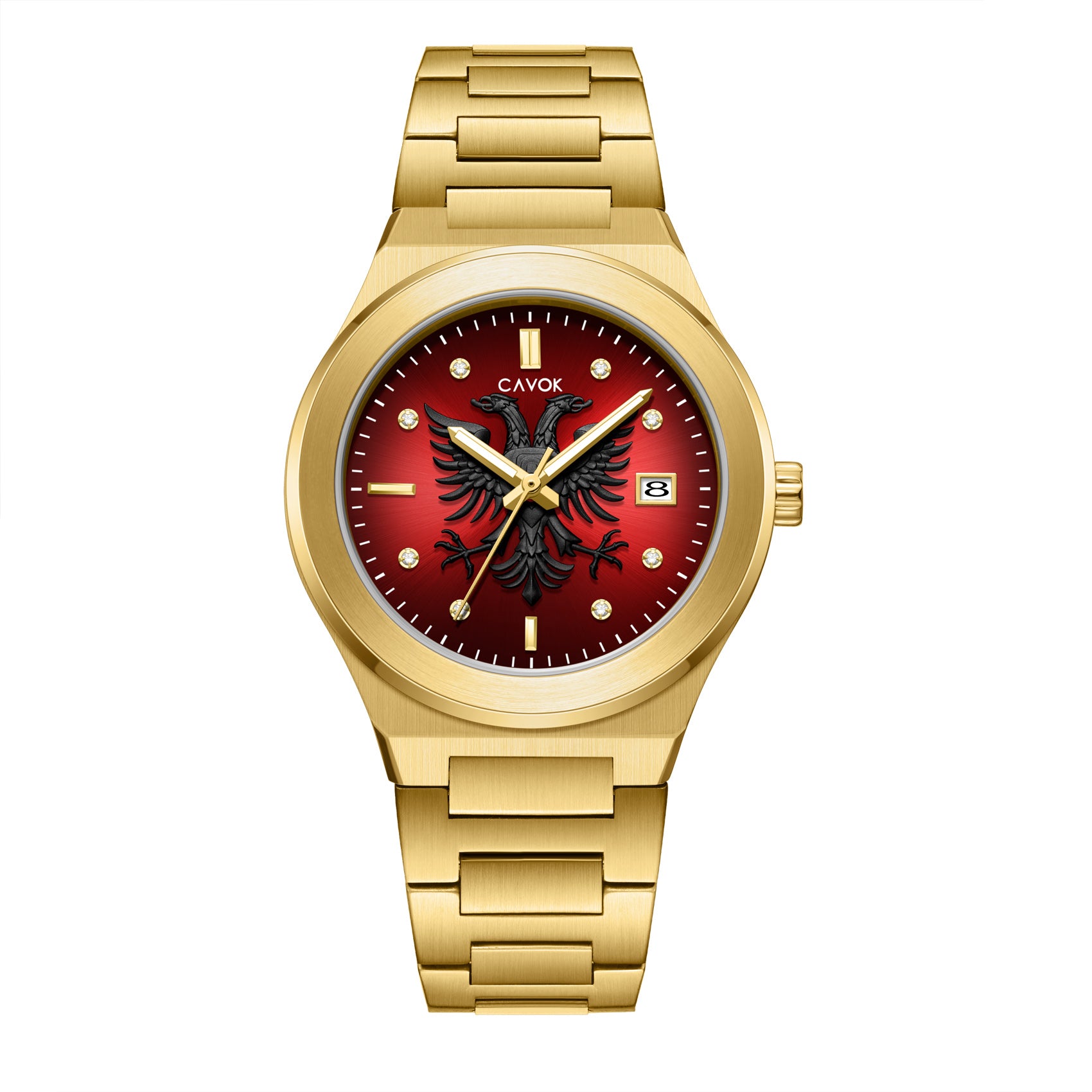 Step into the lineage of Illyrian royalty with the CAVOK Teuta Regalia. Outfitted in 316L stainless steel with a rich gold PVD finish, its slender 36mm case merges seamlessly into an integrated bracelet for a sleek, contemporary silhouette. Beneath the sapphire-coated crystal rests a vibrant red sunburst dial, where a sculpted 3D Albanian double-headed eagle rises in deep black relief. At 3 o’clock, a framed date window adds practical elegance, while eight faceted indices catch the light like sparks of heritage.