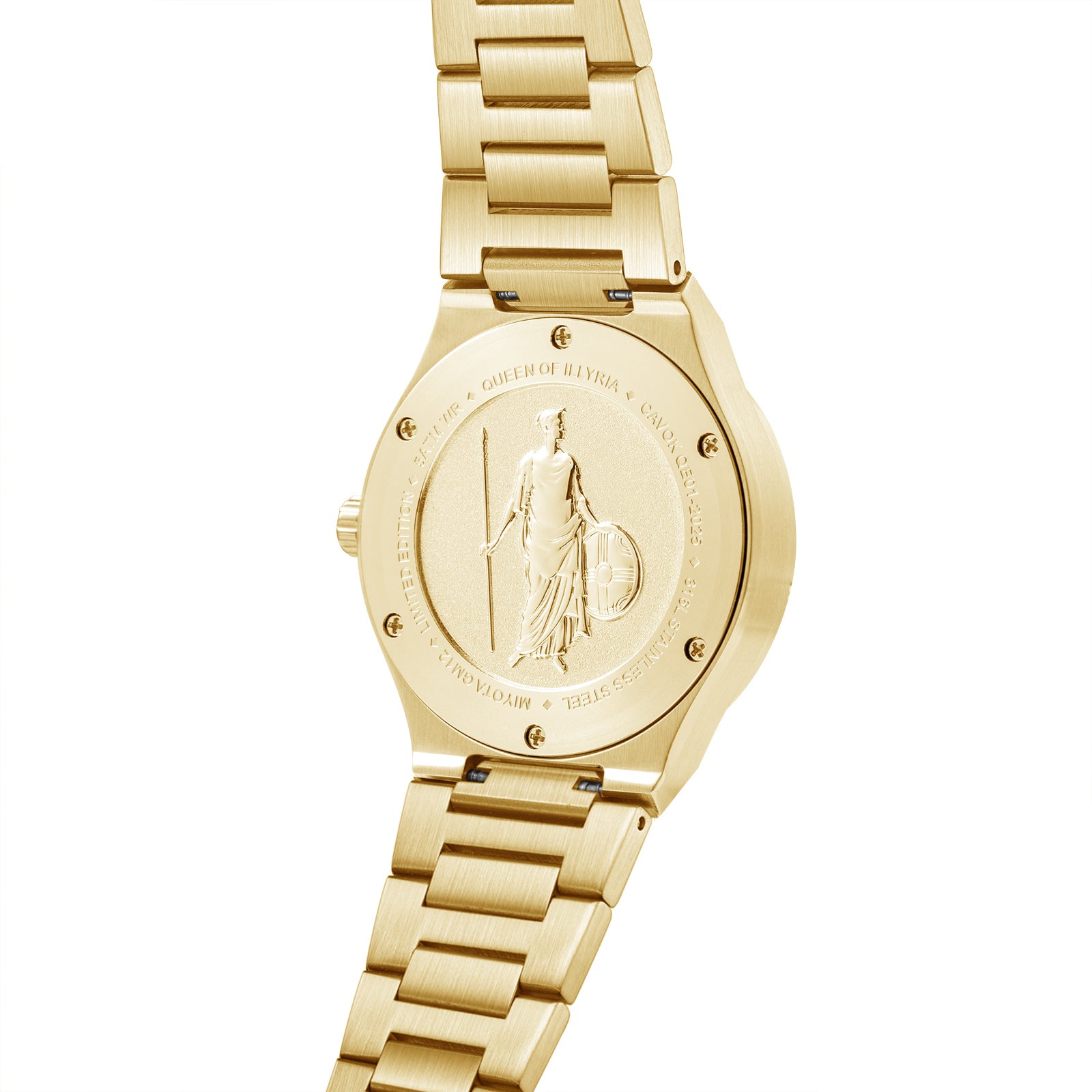 On the reverse, the solid caseback carries a three-dimensional rendering of Queen Teuta of Illyria, spear and shield in hand, encircled by the engraving “QUEEN OF ILLYRIA"