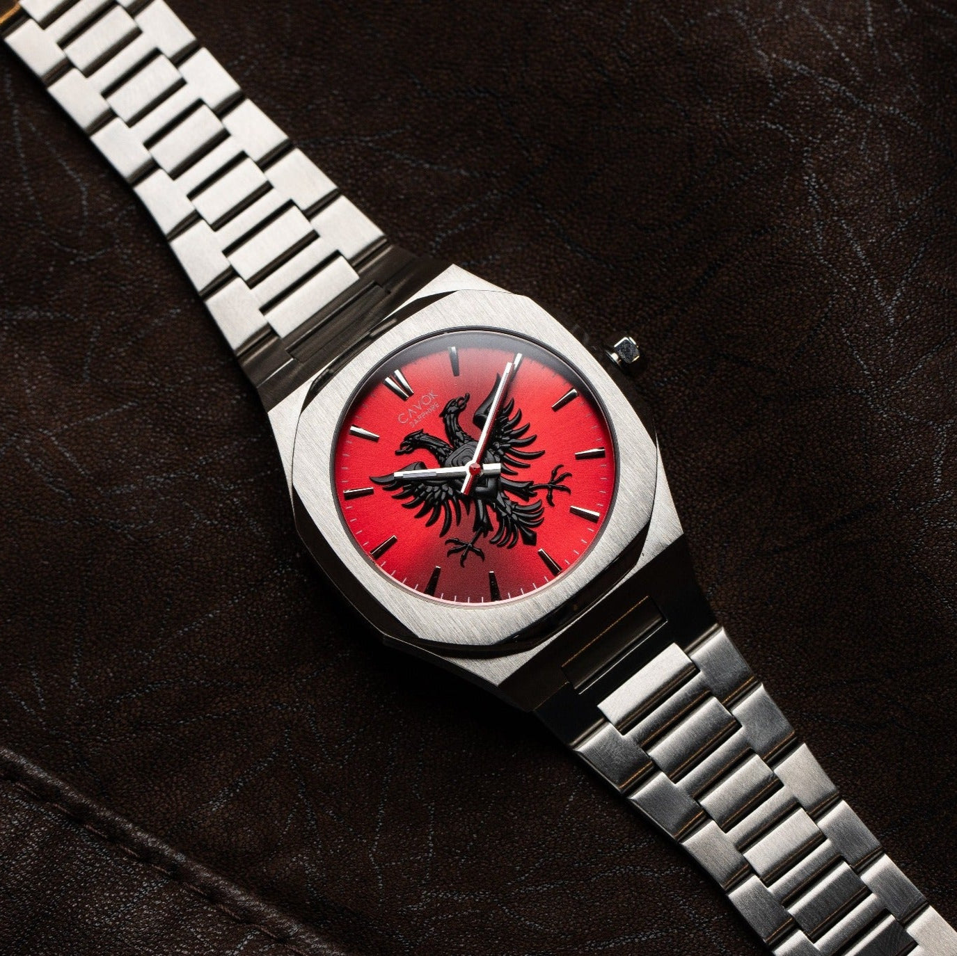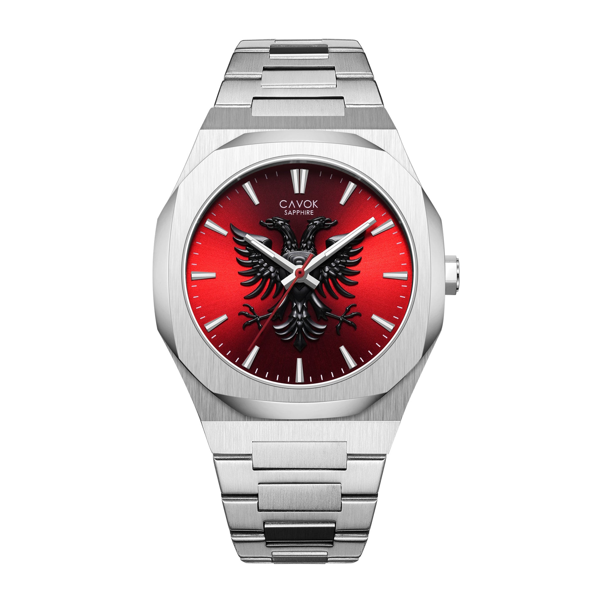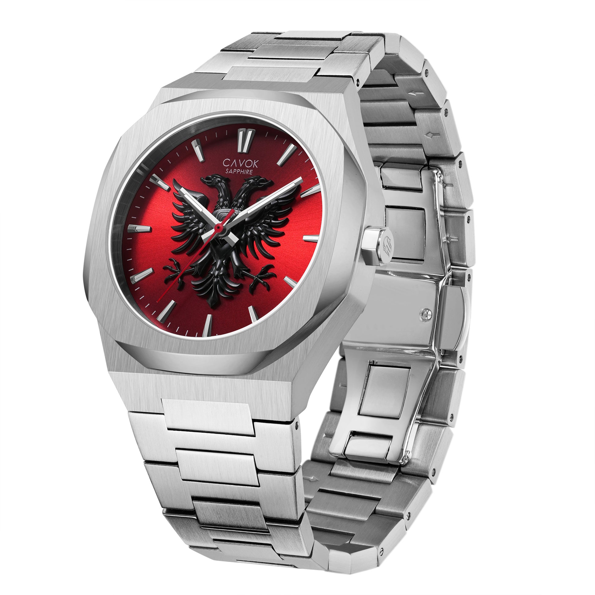 The Cavok Silver Eagle watch combines elegance and strength, featuring a stunning red dial adorned with a 3D eagle emblem that symbolizes power and freedom. Inspired by the Albanian flag, the vibrant red face stands out, encapsulating the spirit of Albania.