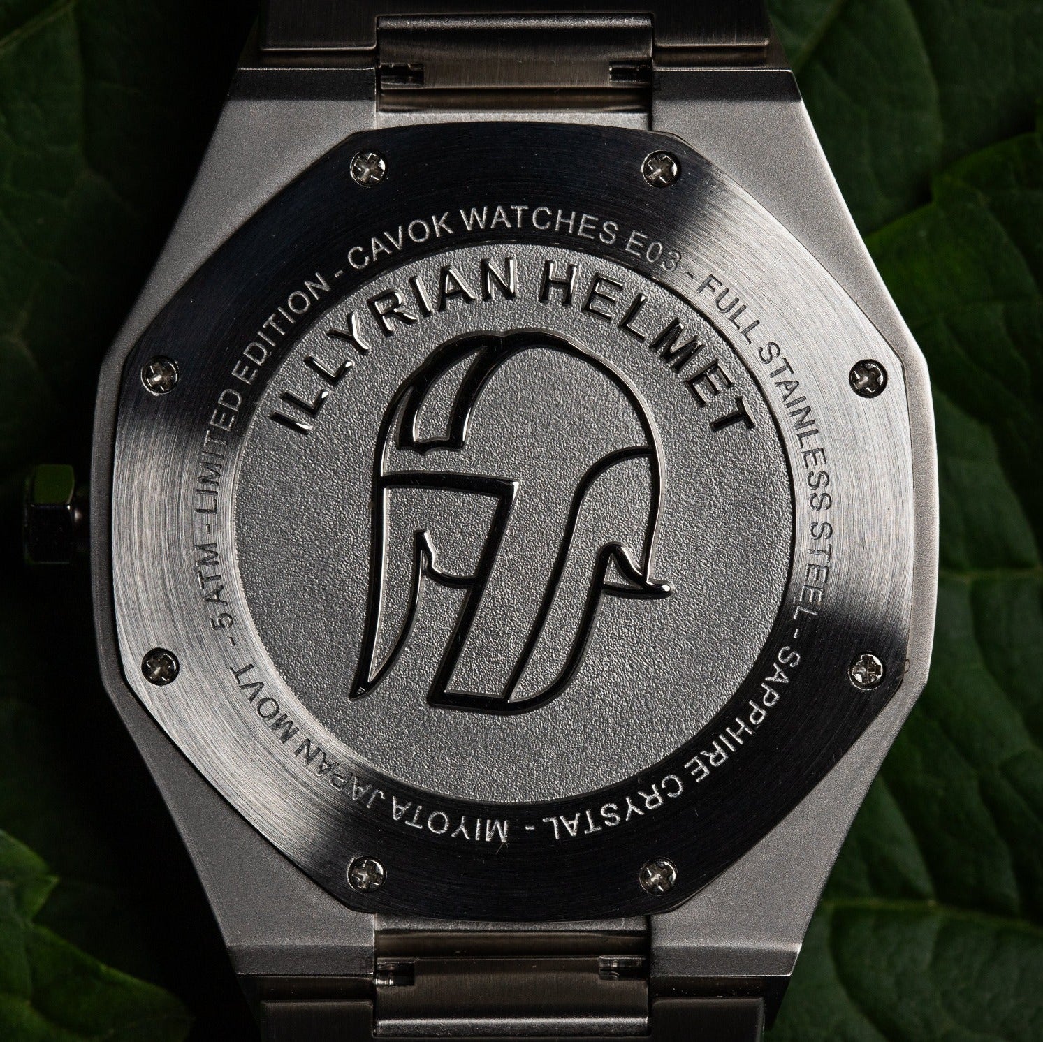 The case back features a 3D embossed Illyrian helmet, adding a touch of historical significance. This timepiece comes with a 2-year warranty, guaranteeing its reliability and craftsmanship.